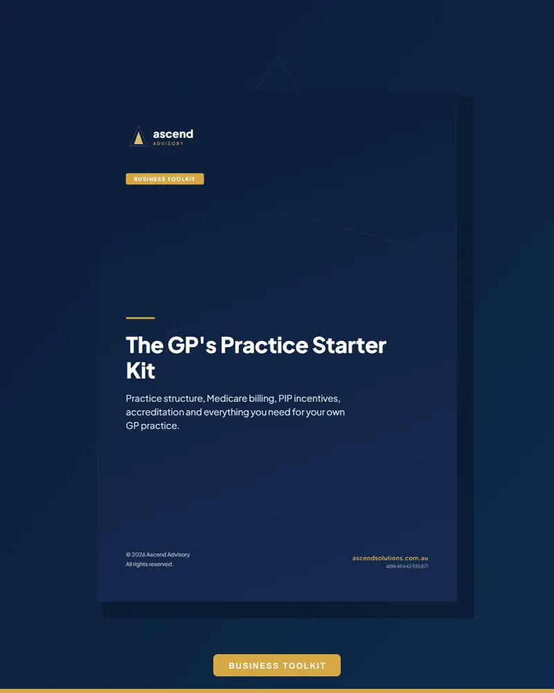 The complete starter kit for GPs — practice structuring, Medicare billing, PIP/WIP, accreditation, and medical indemnity.